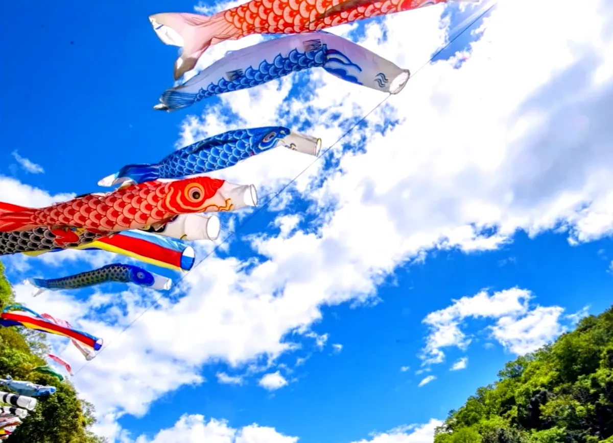 Overhead, carp streamers hang against the open sky, moving slowly, giving the whole thing just enough seasonal strangeness to stop it becoming a generic nice-nature-walk. You step from cool dark into that, blinking, with river sound below and koinobori above, and for a moment it does not feel much like a hiking trail.