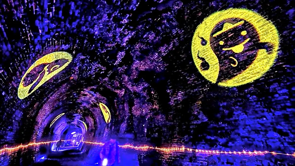 The site features four red-brick tunnels, numbers three through six. The first thing you notice stepping inside is the temperature. Spring air vanishes. The damp takes over — wet brick, cool earth, the faint mineral edge of water somewhere close. Your flashlight catches old masonry, moss, a ceiling still marked with soot from the steam era.