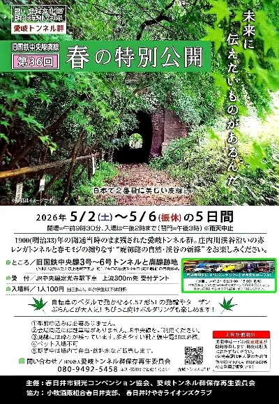 The Aigi Tunnels open twice a year — spring and autumn — and stay locked the rest of the time. This spring's special opening runs from May 2 to May 6. Entry is ¥100.