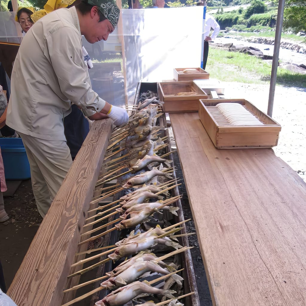 After working up an appetite from fishing, you can head to the BBQ area by the river. The BBQ setup includes everything you need for a delightful meal in nature. The site offers grilled ayu, a local delicacy, and gohei mochi, a rice cake with a walnut miso glaze. You can also enjoy ayu rice, ramen, and a variety of beverages.