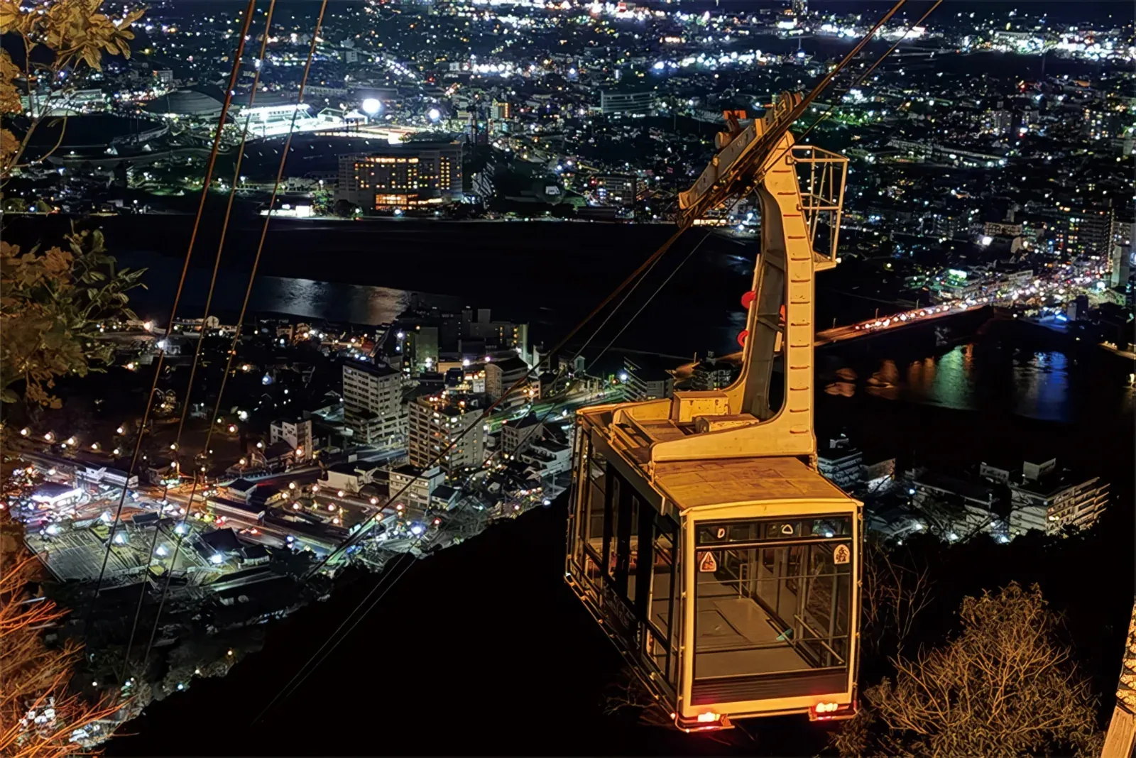 During the event, the Gifu Kinkazan Ropeway runs at night. From the top of Mount Kinka, you get a panoramic view of the city and a downward look at the illuminated park below. The castle tower above—Gifu Castle—adds a second vantage point, turning the light-up into something you can look down on as well as walk through.