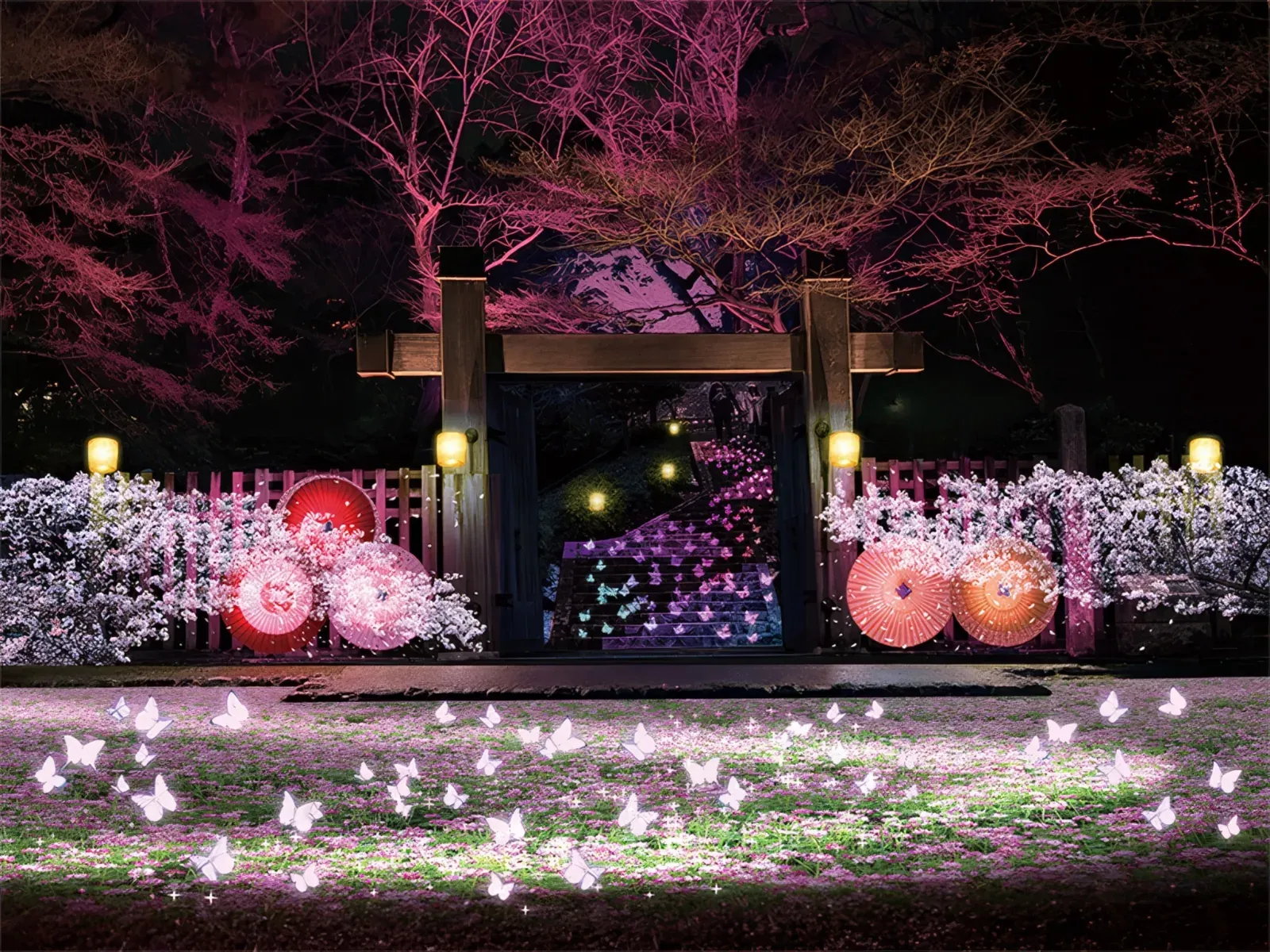 The experience stays consistent as you move through the creation. Instead of building LED tunnels or importing structures, Gifu works with its umbrellas, red chochin lanterns... the rock wall below the castle. Projection mapping is layered onto those surfaces rather than replacing them. The largest installation, Tree of Life, is mapped directly onto the cliff face. On the ground, seasonal patterns—cherry blossoms, drifting shapes—slide across the paths. The umbrellas get their own mapped sequences, ribs and shadows shifting slowly as the light cycles.