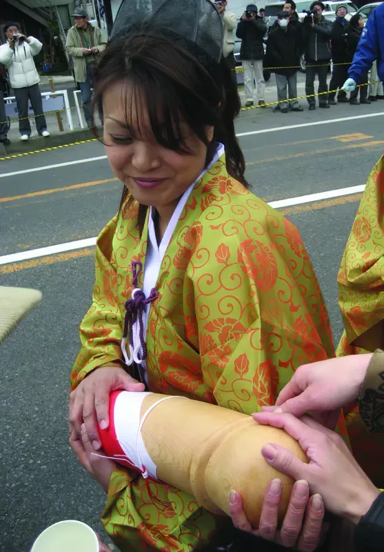 Women carry wooden phalluses about the size of a person's arm, cradling them ceremonially and allowing attendees to touch them for good fortune. Even local politicians participate, offering campaign messages and blessings before the main attraction appears, the Ōowasegata, an enormous, red, 600-pound wooden phallus that requires at least eight men to bear its weight.