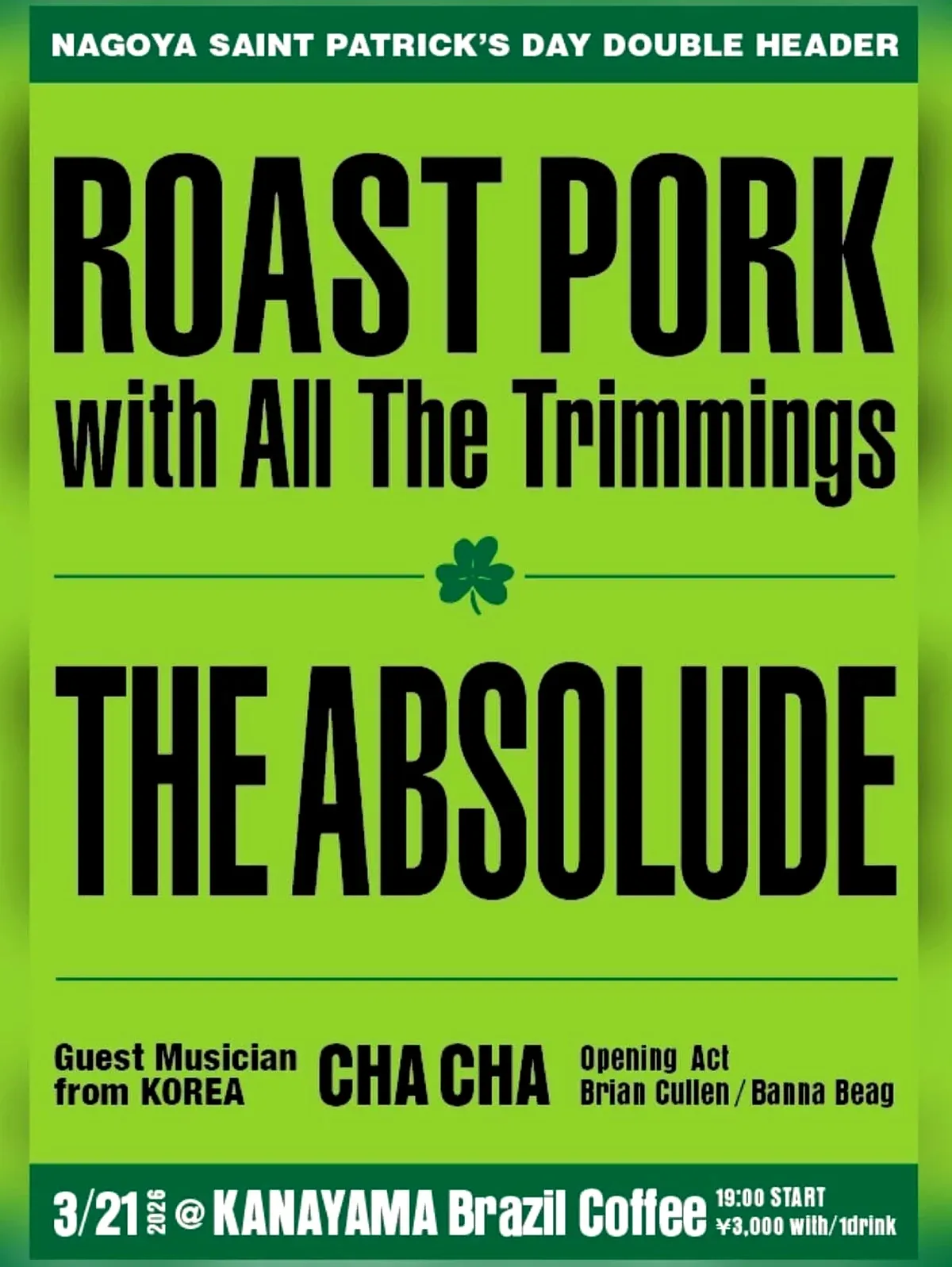 In real life he came up playing punk with No Brain, one of the bands that shaped Korea’s modern underground, then shifted toward the garage rock and blues end of things with The Moonshiners. He’s performing as Cha Cha. A Korean garage-rock actor on a St. Patrick’s night bill in Nagoya is another extra worth showing up for.