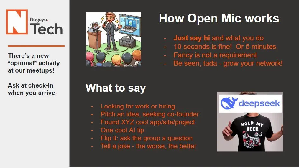 A highlight of every Nagoya.Tech meetup is the Open Mic session, and Robot Night will be no exception. This signature feature gives attendees five minutes to pitch projects, announce job opportunities, or simply introduce themselves to the community. Participation is entirely optional, but these brief presentations often spark the most meaningful connections of the evening.