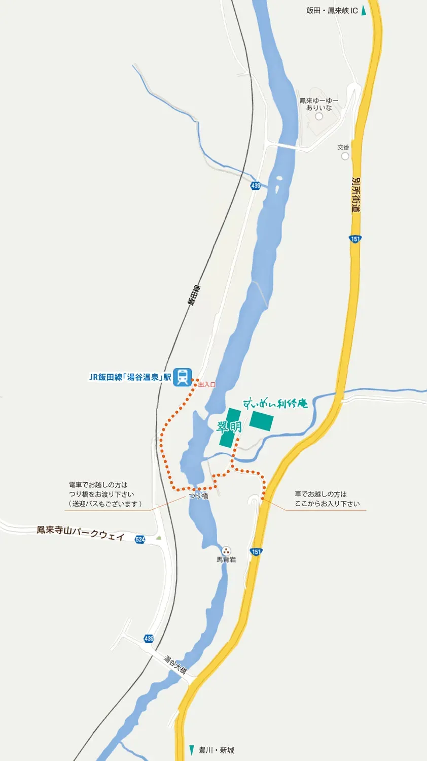 - By Train: Get off at Yuya Onsen Station (JR Iida Line). Exit the station, cross the pedestrian suspension bridge, and follow the dotted footpath shown on the map. Suimei is a 5–7 minute walk.
