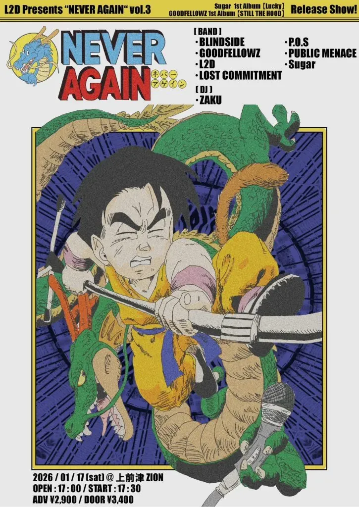 L2D—Livin 2 Die, one and a half years into their New York hardcore pilgrimage—runs the NEVER AGAIN series, and vol.3 is the biggest assembly yet. The occasion is dual: Goodfellowz from Niigata dropping their debut full-length Still the Hood, and Sugar from Hiroshima releasing Lucky. They're joined by three out-of-town veterans who've been doing this since the Bush administration, plus one brand new grindcore outfit whose members perform in ski masks because, honestly, why the hell not.