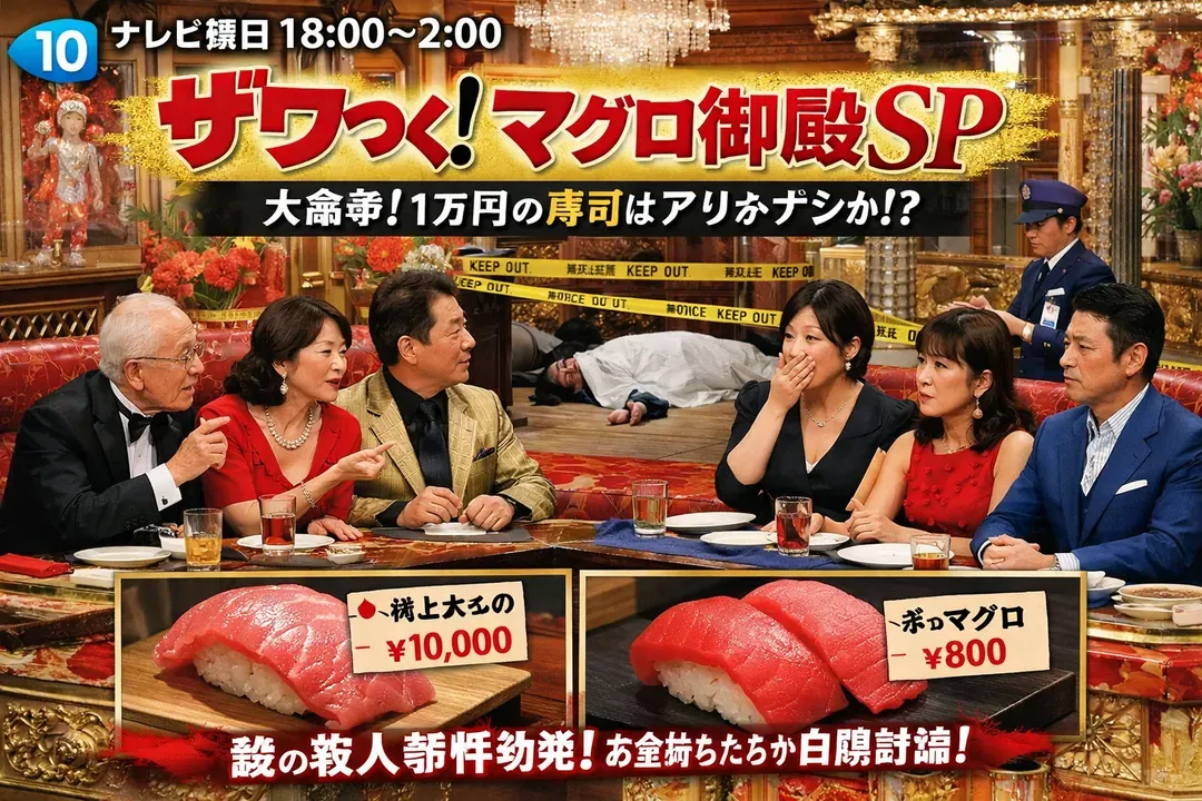 Zawatsuku! Maguro Goten SP - Rich people blind-taste ¥10,000 tuna against ¥800 convenience store scraps. For eight hours. Someone's dead body is literally taped off behind them. The panel gasps at fish that costs more than your rent.